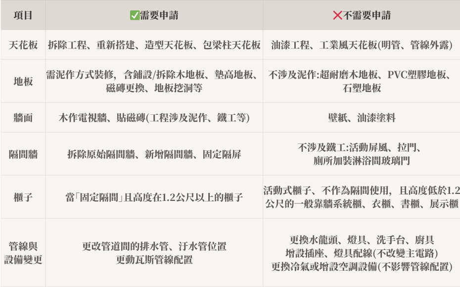 以下為最常見需要申請室內裝修許可的情形,裝修前務必確認是否須報備或申請: