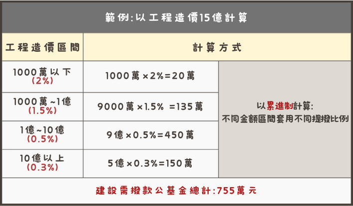公共基金採「累進制」計算方式,依工程造價金額分段提撥,不是單一比例。