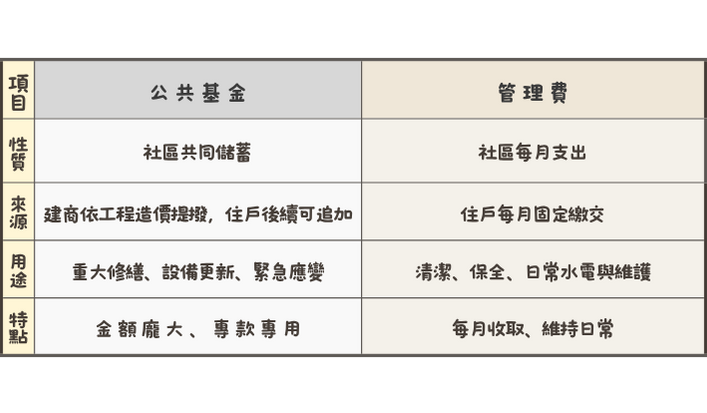 📌 簡單來說,管理費 = 每月日常支出,而公共基金 = 長期維護儲蓄。