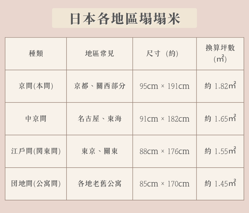 在日本,不動產面積常以「畳(帖)」標示,但每個地區的塌塌米尺寸其實不同,因此不同縣市的「1帖」換算成 ㎡ 也略有差異
